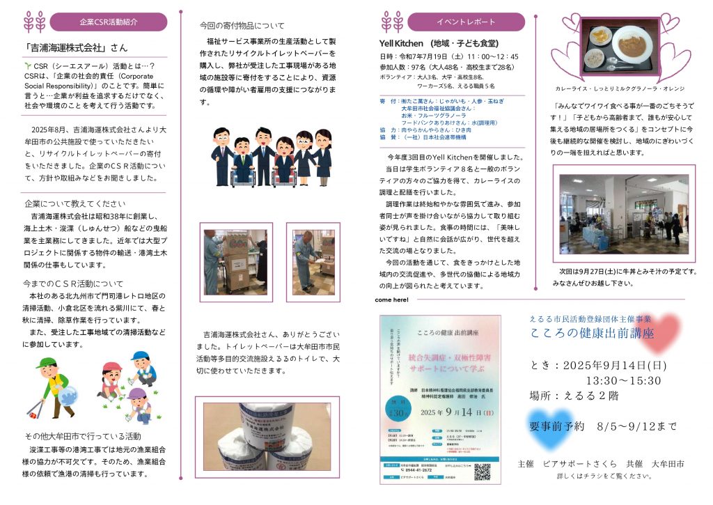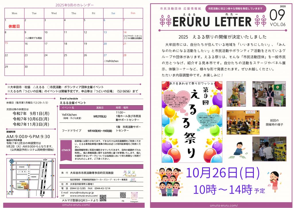 ワーカーズコープ・センター事業団 九州事業本部 ちくご広域まちづくり事業所が大牟田市から受託して運営している「大牟田市民活動支援センターえるる」のニュースレターをお送りします。 ERURU LETTER9月号(PDF)