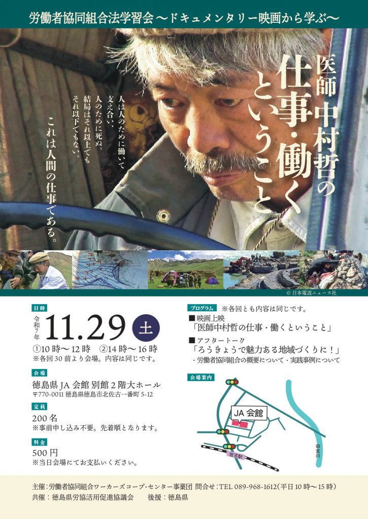 労働者協同組合法の学習会を開催します!日時:2025年11月29日(土) ①10:00~12:00 ②14:00~16:00 ※各回の内容は同じです。会場:徳島県JA会館別館2階大ホール定員:200名 ※事前申し込みは不要です。先着順でご案内します。参加費:500円 (当日会場にてお支払いください)