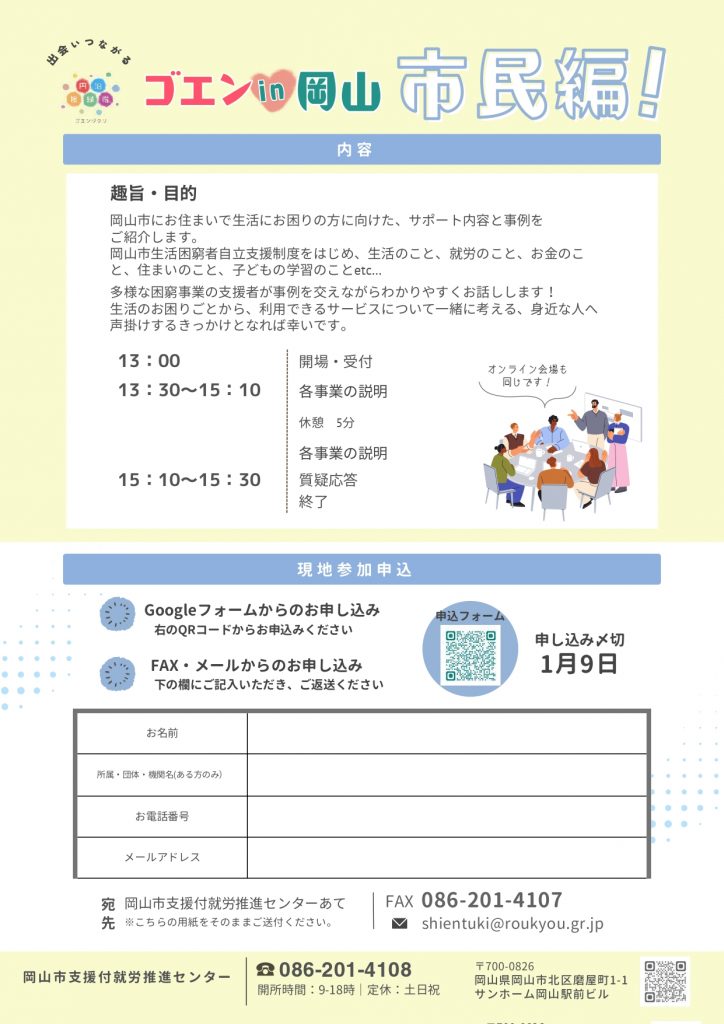 岡山市生活困窮者自立支援制度をはじめ、生活のこと、就労のこと、お金のこと、住まいのこと、子どもの学習のことetc…